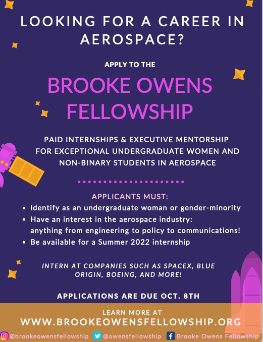 Learn More: All undergraduates and those who teach and advise them are invited to an information session to learn about the Patti Grace Smith Fellowship (pgsfellowship.org), a non-profit program that provides scholarships, mentorship, internship opportunities, and more to Black and African-American undergraduates who aim to start a career in aerospace.